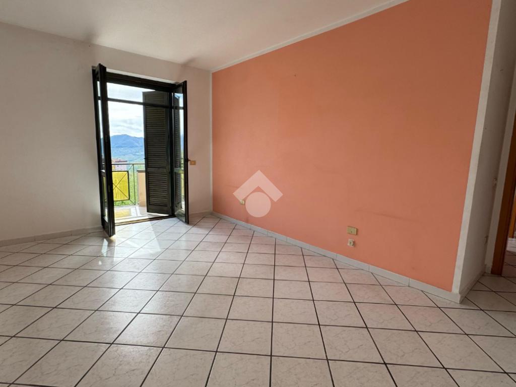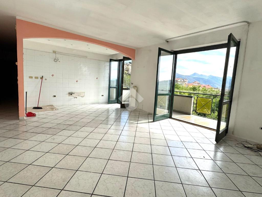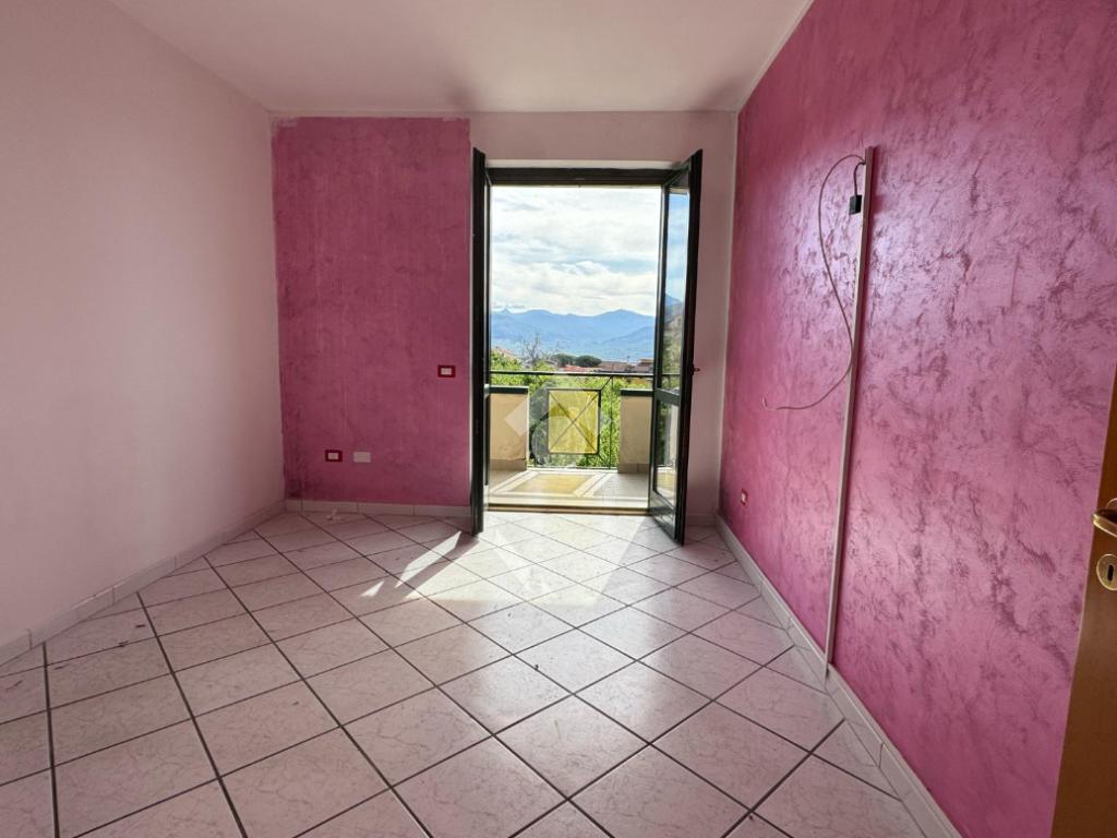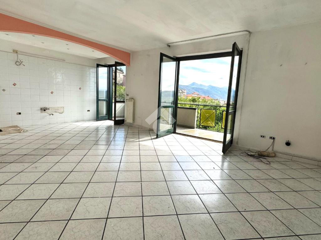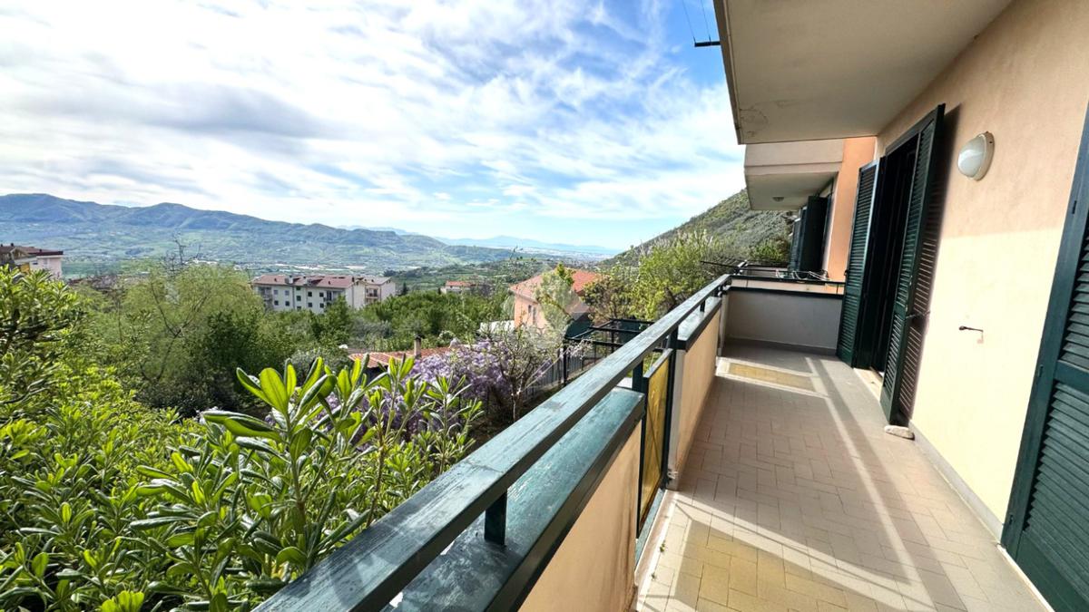 L’abitazione si apre su un luminoso soggiorno con cucina a vista, caratterizzato da un doppio affaccio che conduce ad un ampio balcone privato, dal quale si può godere di una splendida vista panoramica sui Monti Picentini.